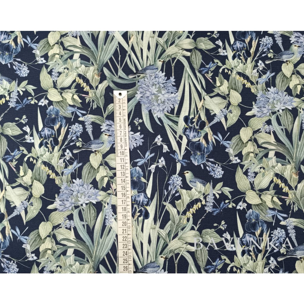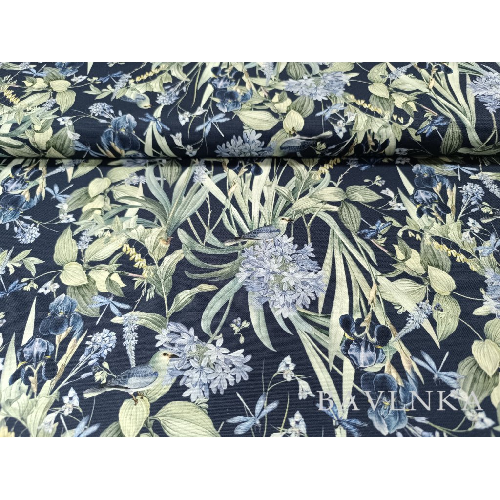 Dekoračná látka - kanava digitálna tlač kvetov a vtáčika na tmavomodrom podklade je vhodná napríklad na rôzne dekorácie, patchwork, vankúšiky, obliečky, obrusy, závesy, ale aj na rôzne doplnky alebo jednoduchú sezónnu tašku.