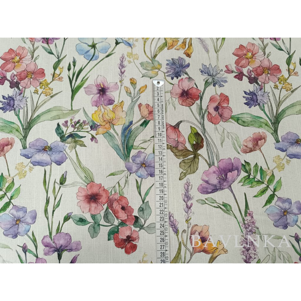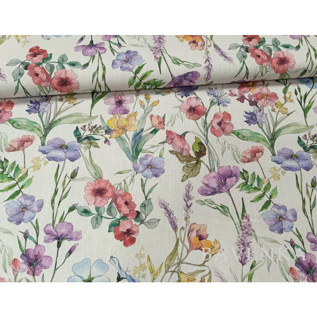 Dekoračná látka s lúčnymi kvetmi v prírodnej farebnej kombinácii a je vhodná napríklad na rôzne dekorácie, patchwork, vankúšiky, obliečky, obrusy, závesy, ale aj na rôzne doplnky alebo jednoduchú sezónnu tašku.