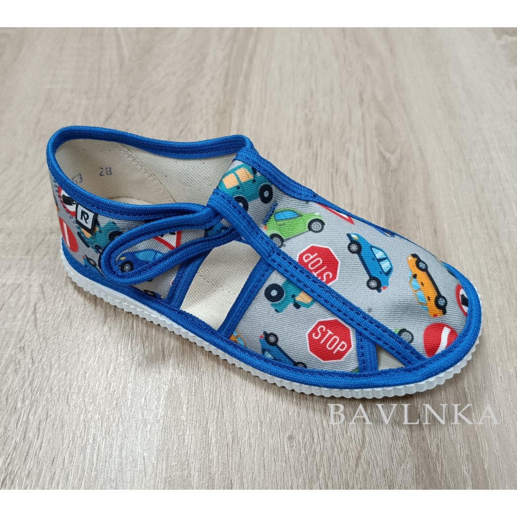 Detské papuče, sandálkového strihu s uzavretou špicou so zapínaním na "suchý zips ". Tvar špičky s dôrazom na typicky detský dominantný palček zabezpečuje dostatočný priestor pre prsty. Papučky sú ľahké, pružné, vyrobené z textilu ( zo 100% bavlny ), ktorý zabezpečuje priedušnosť a dokonalú prispôsobilosť tvaru nohy. Stielka papučky je v časti klenku vyplnená penovým materiálom, čo zabezpečuje dieťaťu pohodlnú chôdzu a podporuje zdravý vývoj nohy. Obuv je určená do interiéru ako prezúvková obuv. Je zdravotne a hygienicky nezávadná. Obuv sa ako nová môže na hladkých povrchoch šmýkať ( keramická dlažba, laminátová podlaha...) V rámci licenčného oprávnenia na používanie ochrannej známky Žirafa a Česká kvalita bola posudzovaná komisiou odborníkov a detského ortopéda.