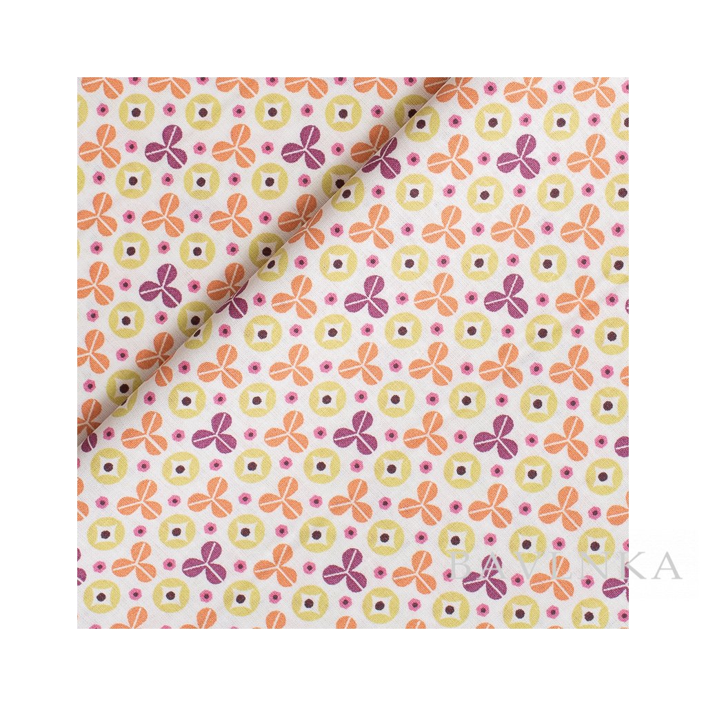 Bavlnená látka s drobným, milým, kvietkovým, resp. trojístkovým motívom v optimistickej farebnej kombinácii je vhodná napríklad na detské oblečenie, rôzne dekorácie, patchwork, rúška, a tiež na vankúšiky, obliečky, obrus, závesy, alebo jednoduchú tašku.