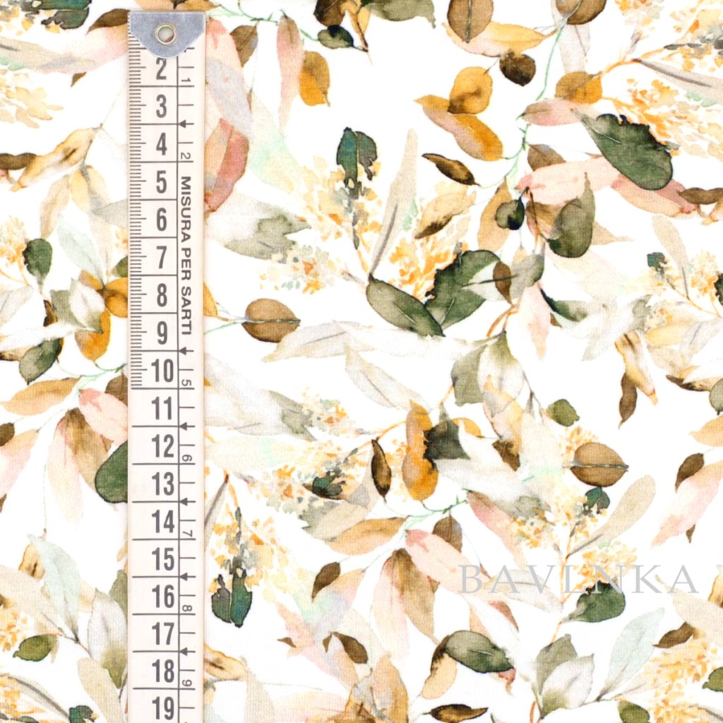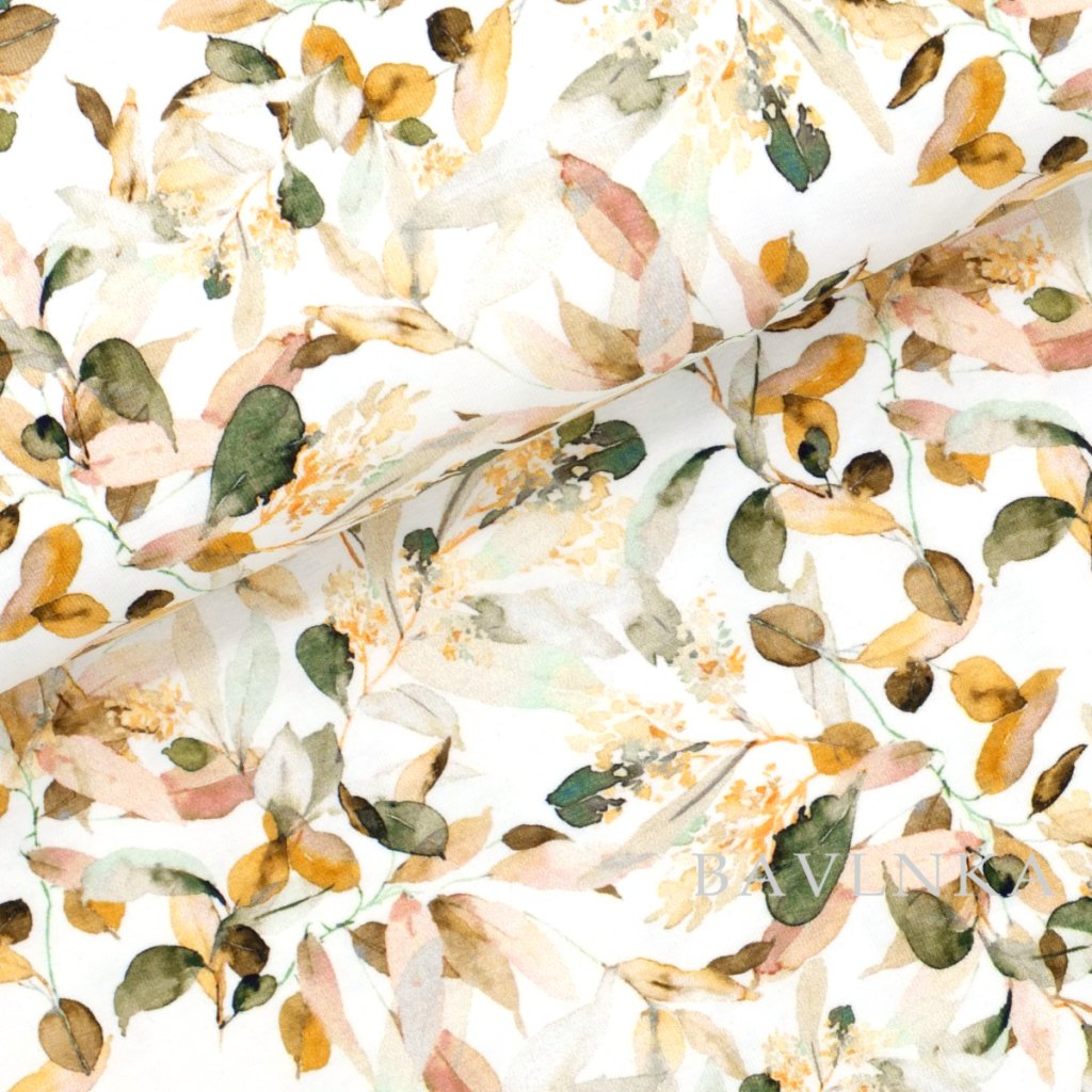 Úplet je obľúbený, mäkký, nekrčivý, poddajný a prispôsobivý materiál, ktorý sa na okraji nepára. Úplet jesenné lístie biely (Digi) je v príjemnej, hrejivej, jesennej farebnej kombinácii a je vhodný na rôzne druhy oblečenia, ako napr. tričká a iné topy, legíny, pyžamá, šortky, sukne, šaty, alebo čiapky, ale aj rôzne druhy dekorácií do domácnosti.